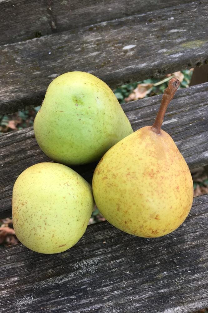 “origine Belgique vers 1830, petite poire jaune, chair rosée fondante, fine, parfumée, maturité decembre à mars ”