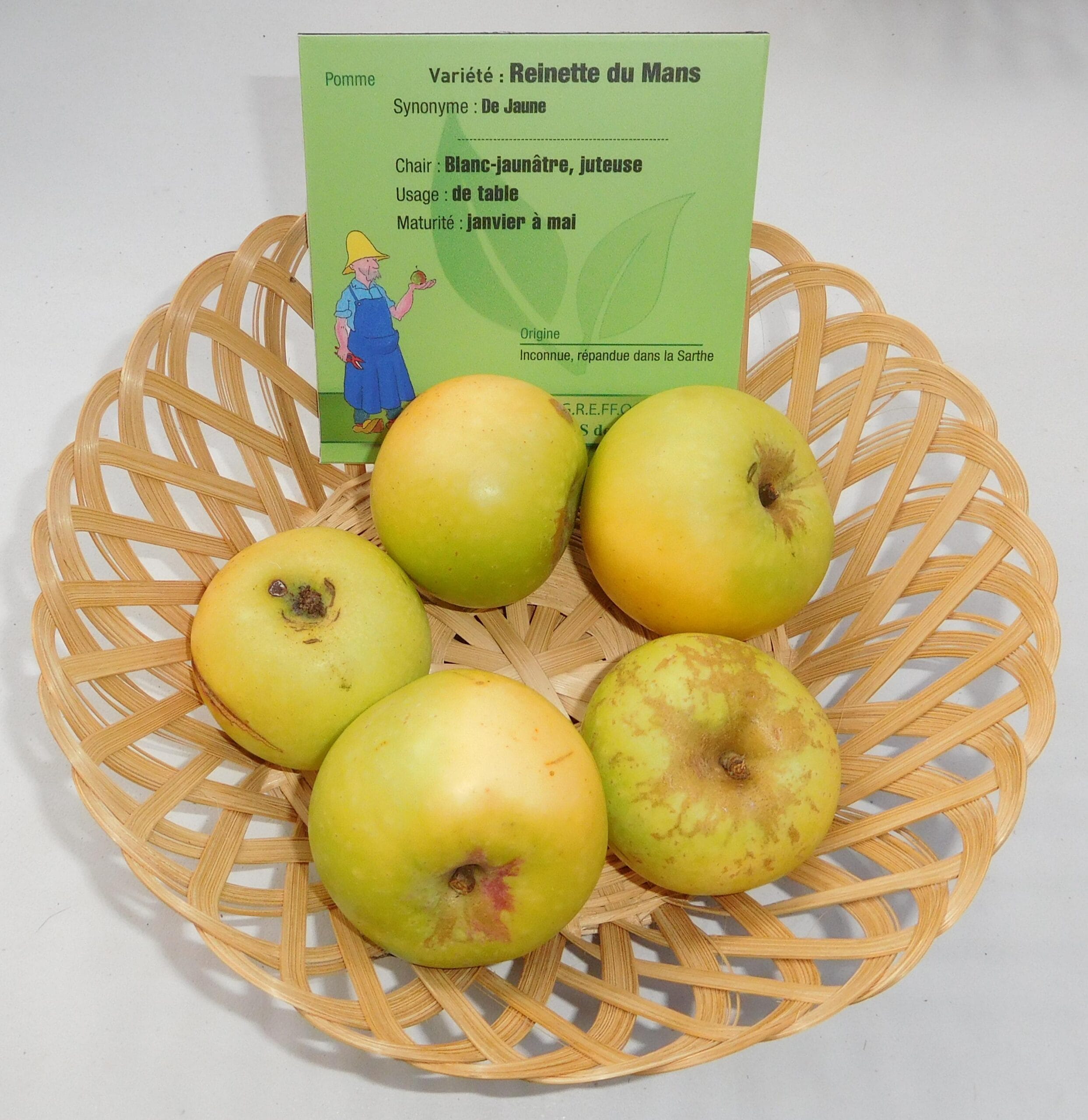 “pomme jaune clair de forme aplatie, saveur douce et sucrée, chair couleur blanc à crème, ferme, fine, juteuse (utiliser aussi pour le jus), bon pollinisateur, floraison tardive, se comporte bien en altitude (fruits meilleurs), maturité janvier jusqu’en mai”